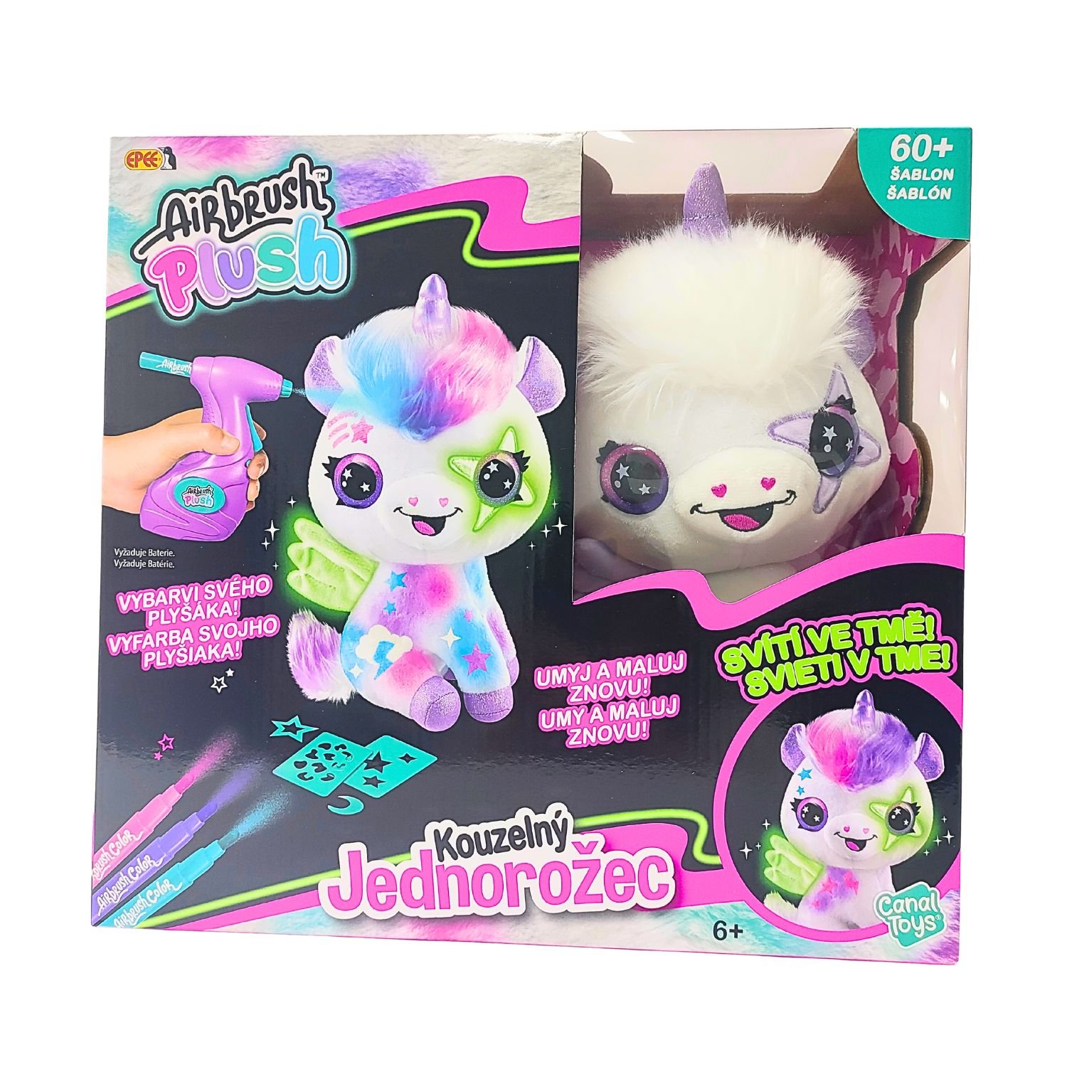 Navrhni a vyfarbi si svojho kúzelného jednorožca, ktorý dokonca svieti v tme. Súčasťou tohto balenia je plyšové zvieratko, airbrush nástroj, 3 rôzne farebné náplne, 60 rôznych šablón a návod. Plyšové zvieratko si môžeš pomocou airbrusha ľubovoľne posprejovať, môžeš využiť rôzne farby a šablóny. Fantázii sa medze nekladú. Pokiaľ sa ti vytvorený design prestane páčiť, stačí plyšáka umyť vodou a môžeš začať znova. Výrobok je vhodný pre deti od 6 rokov a vyžaduje 2× AA batérie, ktoré nie sú súčasťou balenia.