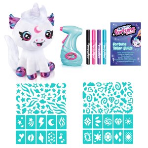 Navrhni a vyfarbi si svojho vesmírneho jednorožca. Súčasťou tohto balenia je plyšové zvieratko, airbrush nástroj, 4 rôzne farebné náplne, 100 rôznych šablón a návod. Plyšové zvieratko si môžeš pomocou airbrusha ľubovoľne posprejovať, môžeš využiť rôzne farby a šablóny. Fantázii sa medze nekladú. Pokiaľ sa ti vytvorený dizajn prestane páčiť, stačí plyšáka umyť vodou a môžeš začať znova. Plyšákovi svieti kúzelný rok a môže odpovedať vďaka farbe rohu na otázku áno-nie. Výrobok je vhodný pre deti od 6 rokov a vyžaduje 2× AA batérie, ktoré nie sú súčasťou balenia a 3 batérie LR44, sú súčasťou. Vek: 6+ .