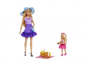 Zahŕňa bábiku Barbie "Malibu" vo fialových šatách a topánočkách a malú bábiku Chelsea v rozkošnom ružovom oblečku s čerešňami.