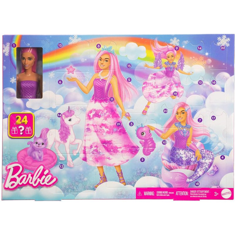 Po dobu 24 dní si každý deň otvorte jedno prekvapenie (alebo ich pokojne otvoríte všetky naraz!) a zažite kúzelný zážitok pri rozbaľovaní. Prvý deň nájdete v kalendári bábiku Barbie s krásnymi ružovými vlasmi a tie ďalšie potom oblečenie a doplnky, ktoré ju premenia na morskú pannu, kráľovnú alebo vílu. Medzi prekvapenia patrí chvost morskej panny, vílie krídla, malý jednorožec a ďalší rozprávkoví zvierací kamaráti, ozdobné čelenky a ďalší. S týmto setom sa deti môžu tešiť na kúzelné sviatky! .