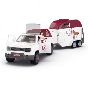Prepána, žriebä tennesseeského mimochodníka sa zranilo! Kulhá a treba ho rýchlo vyšetriť. Ešte šťastie, že pojazdná veterinárka s prívesom nie je ďaleko. O chvíľu prichádza pani Kramerová vo svojom pick-upe. V zadnej časti pick-upu má pani Kramerová veľa miesta a rôzne lekárske nástroje. Vďaka novému röntgenu môže žriebä vyšetriť priamo na mieste. Najskôr urobí röntgenovú snímku. Našťastie nie je nič zlomené. Žriebä dostane obväz a opatrne ho pomocou ohlávky odvedú do prívesu. Za odmenu podá žriebäťu mrkvu. Žriebä bude čoskoro opäť úplne zdravé. Príves pre kone je odpojiteľný. Röntgen sa dodáva s tromi röntgenovými snímkami. Tento výrobok Schleich® patrí do tematického sveta HORSE CLUB.