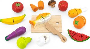Sada na výučbu krájania - malý kuchár od spoločnosti Viga je ideálnou hračkou, ktorá podnieti fantáziu vášho dieťaťa. Drevené hračky v podobe rôznych potravín je možné použiť ako názorný materiál pri skupinových aj domácich aktivitách s deťmi. Zatiaľ čo rodičia pripravujú jedlo pre celú rodinu, náš malý kuchár alebo kuchárka pripraví báječné jedlo z ich obľúbených surovín pre ich bábiky a medvedíky. Vďaka bezpečnému nožu, ktorý je vyrobený z dreva, môže dieťa ľahko "nakrájať" rybu, paradajku alebo melón. Pri spoločnej hre bude môcť každý rodič svoje dieťa naučiť, ako v budúcnosti používať ostré kuchynské doplnky. Ďalšou výhodou je skutočnosť, že všetky výrobky sú spojené suchým zipsom pre nekonečnú zábavu. Všetky majú prepracovaný a realistický vzhľad. Po dokončení jedla ich môžete opäť zložiť dohromady. Hladký povrch a netoxické materiály zaisťujú bezpečnú hru aj pri dotyku hračky malými ústami.