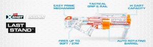 S automaticky rotujúcim barelom s kapacitou 14 šípok zasiahnete viac cieľov až na vzdialenosť 27 metrov. The Last Stand je dodávaný s taktickou rukoväťou a koľajnicou. Šípky X-Shot Skins sú vybavené technológiou Air Pocket Technology, ktorá umožňuje rýchlejšiu, dlhšiu a presnejšiu streľbu.