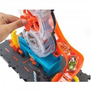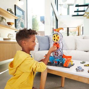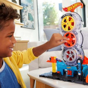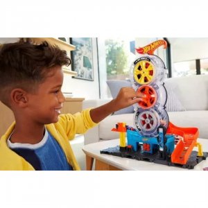 V setu Hot Wheels® City Superpneu obchod děti roztočí poutač městského pneuservisu Hot Wheels™ a sledují, jak jejich auta projíždějí hromadou pneumatik, pak se spustí dolů po rampě a vyrazí za novými dobrodružstvími.