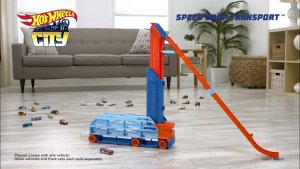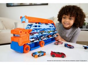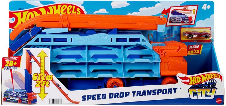 V přepravním režimu pojme velký tahač více než 20 angličáků v měřítku 1:64. Odpojte zadní zámek a proměňte tento tahač v neuvěřitelně dlouhou dráhu pro extrémní vzrůšo. Sjíždějte auty dolů po epickém gravitačním sjezdu, který lze připojit k dalším setům (prodávají se samostatně). Součástí je jeden angličák Hot Wheels®.