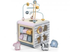 Interaktivní hračka pastelových barev, nabízí pět stran různorodých zábavných aktivit. V horní části lze posouvat tvary po drátech, ze strany jsou otáčecí obrázky, ozubená kolečka a nebo také vkládačka se zvířátky. Vícero aktivit zaujme pozornost dítěte a rozvíjí tak jeho smyslové vnímání.