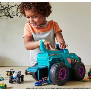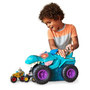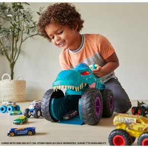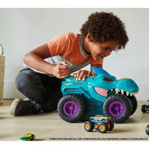 Hrozivý monster truck Hot Wheels W-Rex doslova požírá ostatní menší autíčka. Obrovský terénní auťák s velkými koly a zubatou dinosauří hlavou W-Rexe během okamžiku zhltne každé auto, které pomalejší než on.