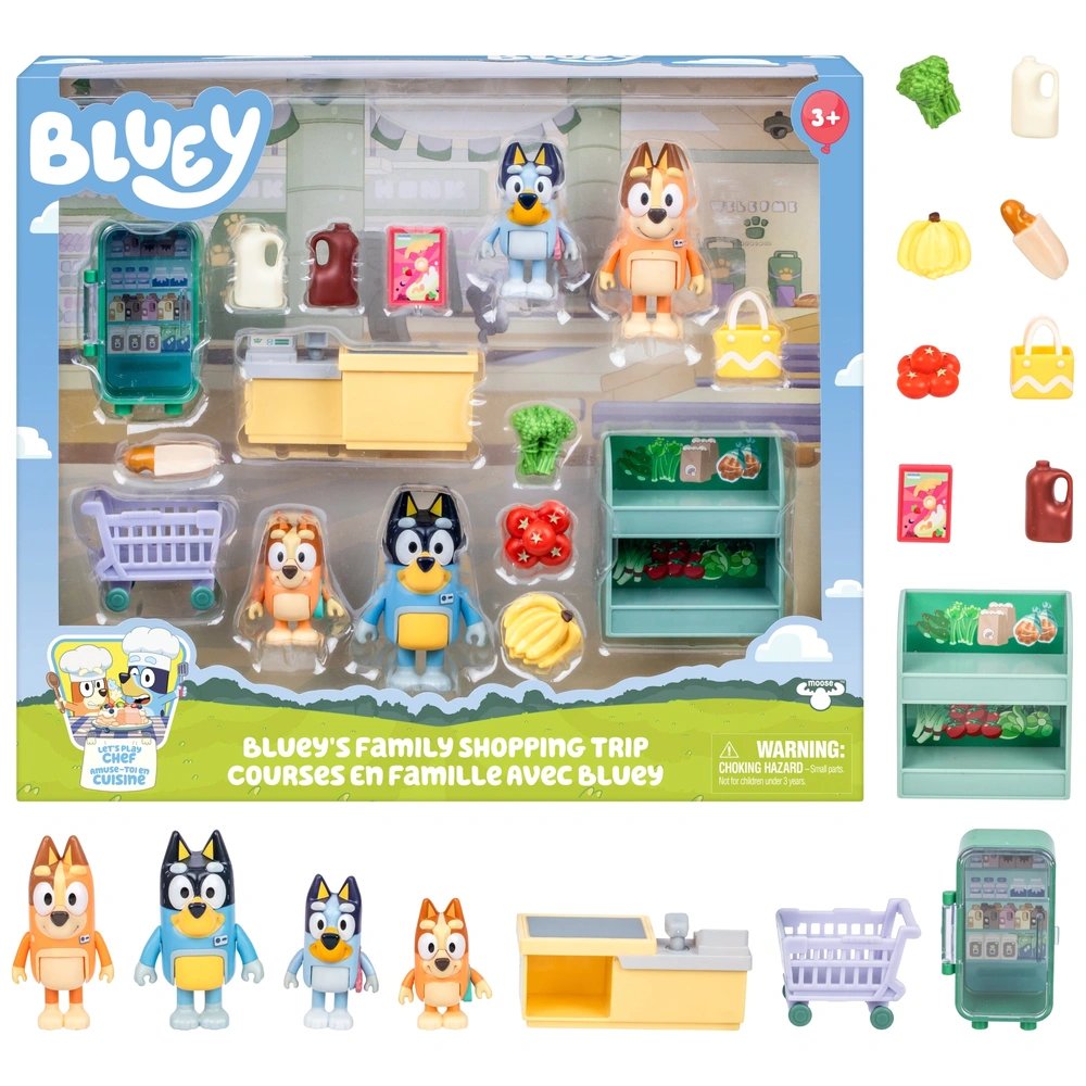 Vydejte se na vzrušující nákupní výlet do supermarketu s Bluey a její rodinou. S touto láskyplně navrženou sadou Bluey si můžete hravě vytvořit rodinné nakupování. Naplňte nákupní vozík Bluey, Bingem, Banditem a Chilli a prozkoumejte police, ledničku v supermarketu a pokladnu.