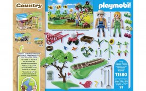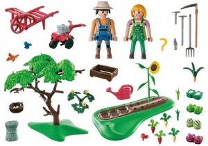 Na zeleninové zahradě je vždycky co dělat! Při správné péči se bude dařit nejen ovoci a zelenině, ale také květinám. S motykou a mnoha zahradnickými pomůckami. Pomozte s péčí o zeleninovou zahradu. Kromě čerstvého ovoce a zeleniny na zahradě rozkvetou také nádherné květiny a jabloň. S kosou, trakařem a mnoha zahradnickými doplňky, které jsou nezbytné pro péči o zeleninové záhony. Předměty z nové řady ekologických farem jsou vyrobeny z více než 80, recyklovaných a ekologických materiálů. Znovu objevte tematický svět PLAYMOBIL.