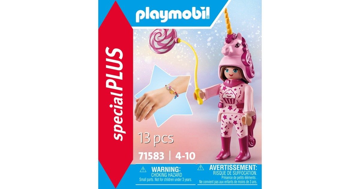 Vydejte se na kostýmovou párty se sladkostmi Unicorn od Playmobil Special Plus se silikonovým náramkem a třemi přívěsky.