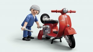 S příslušenstvím a díky odnímatelným kolům lze simulovat výměnu pneumatik. Ale to není vše – různé varianty sedel vám umožní upravit Vespu podle vlastního stylu s originálním sedlem nebo se sedlem pro panáčka PLAYMOBIL.