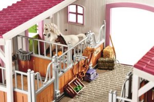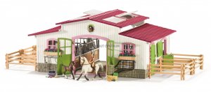 Stáj z edice Horse Club od Schleich je v každém ohledu věrnou kopií reálné stáje, kde jsou koně spokojení a kde je o ně krásně pečováno. Pokud vaše děti milují koně, pak jim neváhejte koupit právě tuhle stáj, nebo jakékoli další koně a příslušenství ze stejné edice. Vše je kompatibilní. Nechte vaše děti užít si péči o koně, krmení a četná dobrodružství. V bezpečí domova si mohou vyzkoušet, jaké to je pravidelně se starat o koně, hřebelcovat ho, chystat mu krmení, cvičit ho a připravovat mu výběh, jehož části mohou být libovolně poskládány podle potřeby. Sada obsahuje důkladně propracované a realisticky vypadající figurky, jak z hlediska stavby těla, tak i výrazu. Samozřejmostí je také stojan na seno, nádrž na pití, včetně truhlíku s květinami, které stáji celkově dodají na útulnosti.