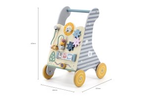 Dřevěné chodítko s herními prvky pro rozvíjení dětské chůze a motoriky, v české krabici. Rozměry cca 45 x 26,7 x 31 cm. Obsahuje různé provlékačky, bludiště a otáčecí hračky. Rozměry balení cca 34 x 47,5 x 11 cm. Věk 18m+