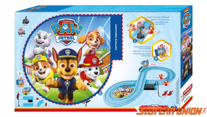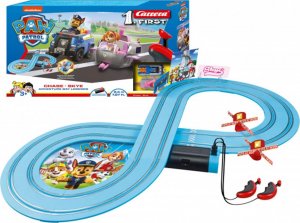 Die 2,4 m lange Carrera FIRST-Autobahn mit Autos aus der Paw Patrol-Serie, für Kinder ab 3 Jahren, batteriebetrieben, beinhaltet Geraden, Kurven, rotierende Propeller, Controller und Dekorationen im Paw Patrol-Stil.
