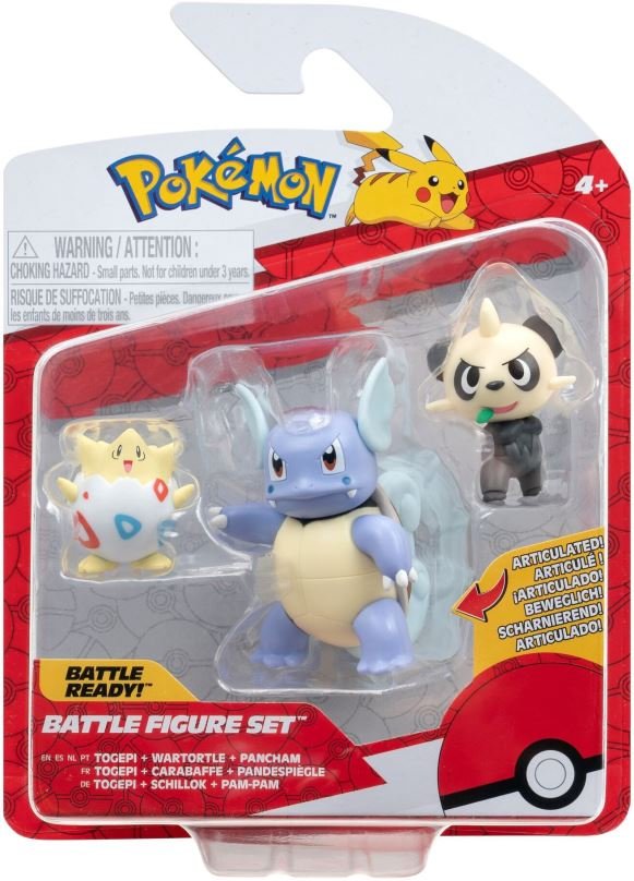 Hauptmerkmale der 3-teiligen Pokémon-Figuren – Togepi, Pancham, Wartortle. Ihre Kinder werden lange mit Jazwares-Figuren spielen. Sie sind für Kinder ab 4 Jahren gedacht.