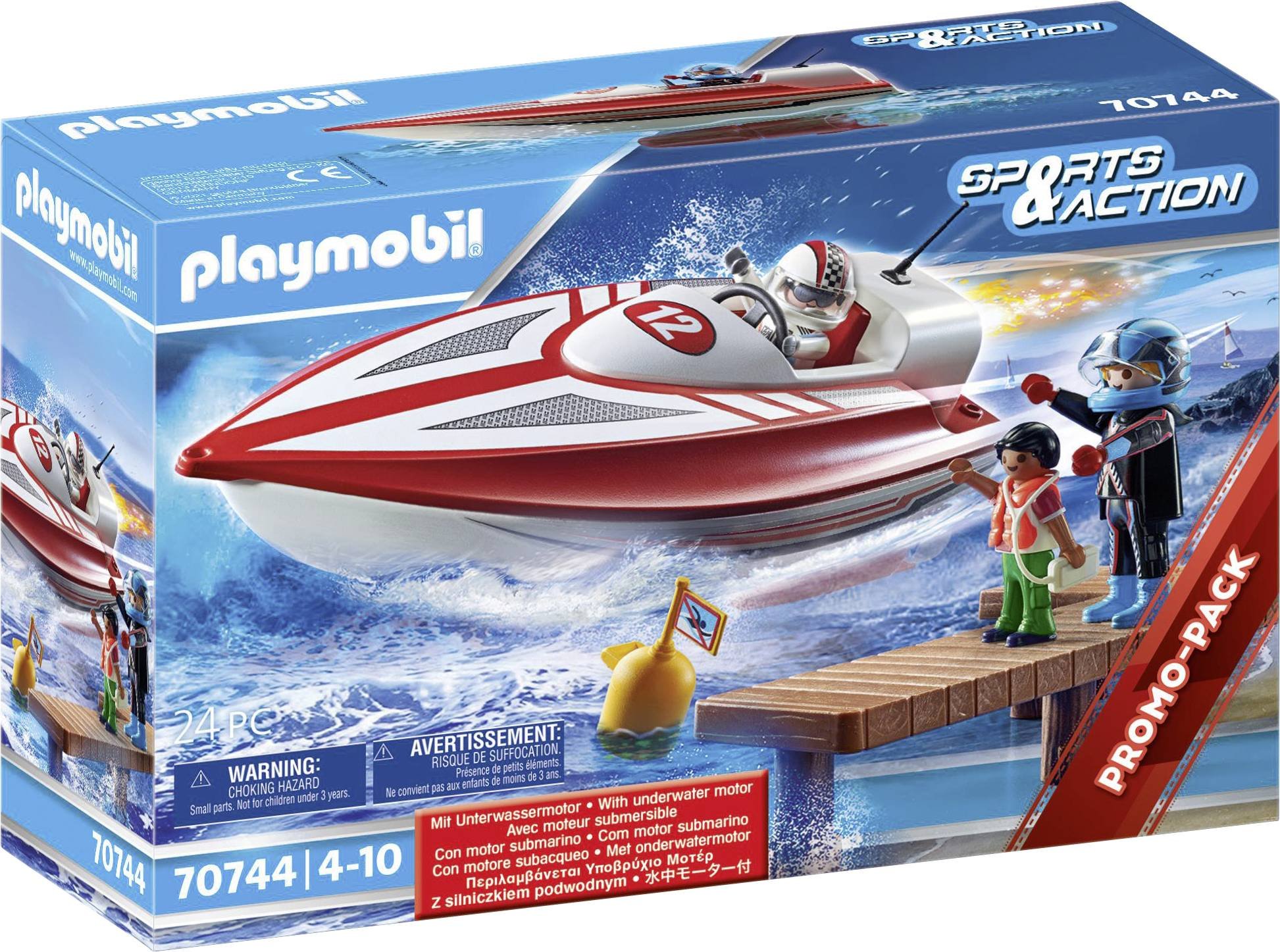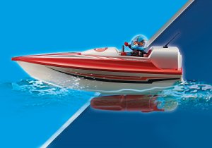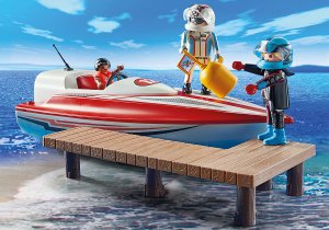 Das Spielset enthält zwei PLAYMOBIL-Figuren mit Schutzhelm, eine Kinderfigur, ein Schnellboot mit Unterwassermotor, eine Boje und viel weiteres Zubehör.