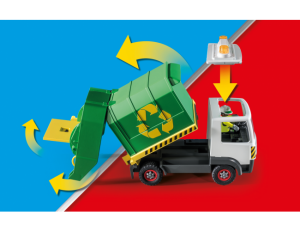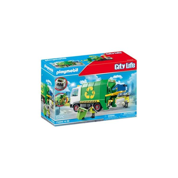 Helfen Sie mit dem PLAYMOBIL Recycling Truck, die Stadt sauber zu halten. Dieser PLAYMOBIL City Life Recycling Truck verfügt über viele realistische Funktionen wie zwei Mülleimer und jede Menge Müll zum Sammeln und Recyceln. Helfen Sie den Reinigungskräften, die Behälter auf die Ladefläche des Lastwagens zu laden, und ziehen Sie dann den Hebel, um jeden Behälter anzuheben und zu entleeren. Zum Entleeren des Fahrzeugs wird der gesamte Container hochgekippt und der Heckanbau angehoben. Einfacher Zugang zur Fahrerkabine dank abnehmbarem Dach. Zwei Mitarbeiter der Sanitärabteilung können im Fahrzeug mitfahren. Ganz wie im echten Leben: Die Figuren können links und rechts hinten im Fahrzeug stehen und sich während der Fahrt am Haltegriff festhalten. Enthält 2 PLAYMOBIL-Figuren. Abmessungen: 10,6 x 4,7 x 6,4 Zoll (LxBxH). Empfohlen für Kinder im Alter von vier bis zehn Jahren. Warnung. Erstickungsgefahr. Kleine Teile.