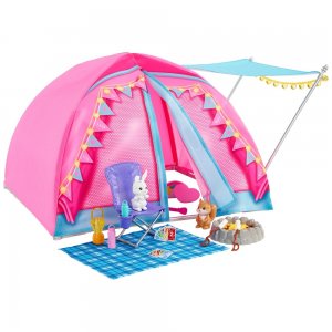 Látkový stan je vybavený markízou a povrázkovými svetlami – a vďaka priestoru pre štyri bábiky sú možnosti rozprávania nekonečné. Set obsahuje viac ako 20 doplnkov na kempovanie. Nechýbajú dvaja rozkošní zvierací kamaráti, stoličky, ďalekohľad a ďalší. Bábiky nevedia samostatne štát.