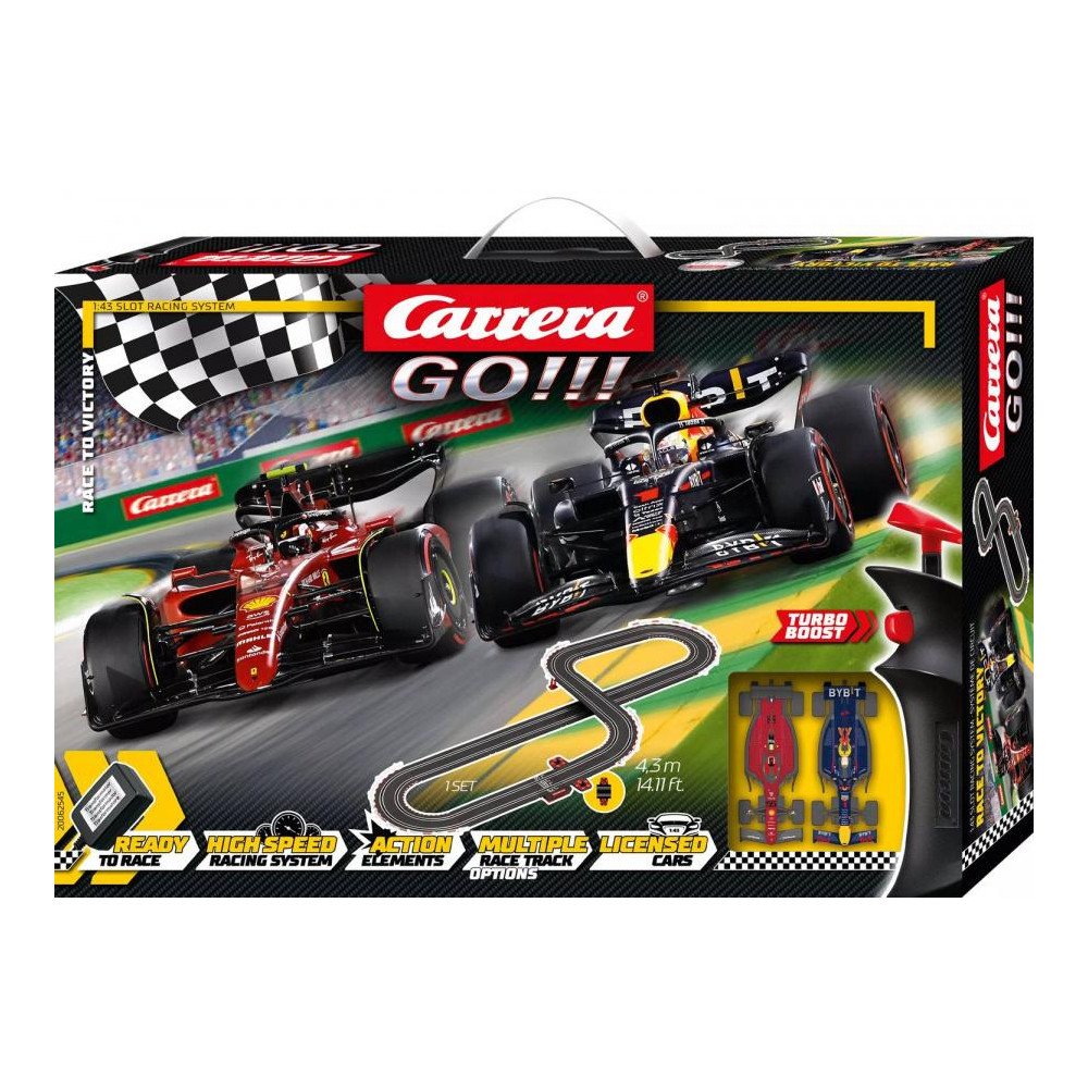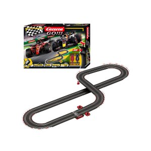 Autodráha Carrera GO!!! dlhá 4,3 m s autami F1 Ferrari a Red Bull, obsahuje premostenie, rovinky, zákruty, diel s počítadlom kolies a ďalšie diely. Môžete si zostaviť ďalšie rôzne trate podľa svojej fantázie.