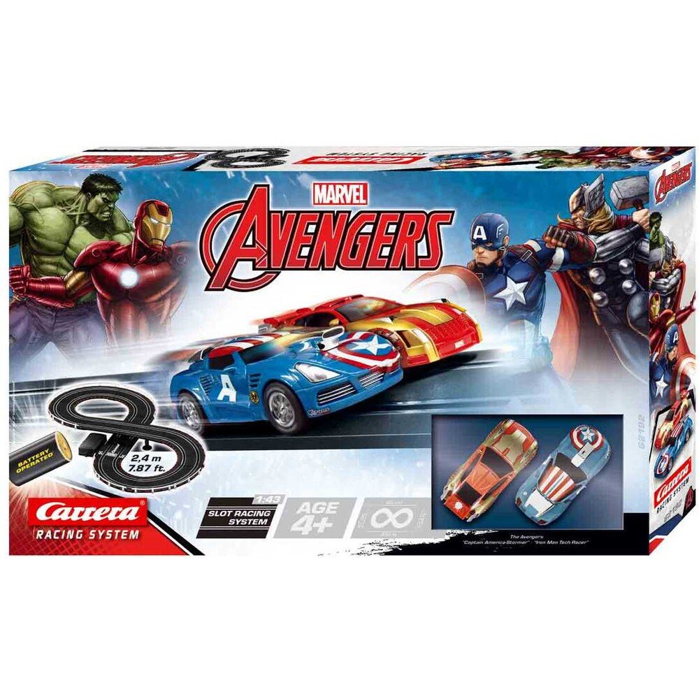 Autodráha Carrera GO!!! dlhá 2,4 m s autami z filmu Avengers Captain America a Iron Man obsahuje rovinky, zákruty, premostenie, napájací diel na batérie a ďalšie diely.
