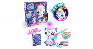 Navrhni a vyfarbi si svojho vesmírneho jednorožca. Súčasťou tohto balenia je plyšové zvieratko, airbrush nástroj, 4 rôzne farebné náplne, 100 rôznych šablón a návod. Plyšové zvieratko si môžeš pomocou airbrusha ľubovoľne posprejovať, môžeš využiť rôzne farby a šablóny. Fantázii sa medze nekladú. Pokiaľ sa ti vytvorený dizajn prestane páčiť, stačí plyšáka umyť vodou a môžeš začať znova. Plyšákovi svieti kúzelný rok a môže odpovedať vďaka farbe rohu na otázku áno-nie. Výrobok je vhodný pre deti od 6 rokov a vyžaduje 2× AA batérie, ktoré nie sú súčasťou balenia a 3 batérie LR44, sú súčasťou. Vek: 6+ .