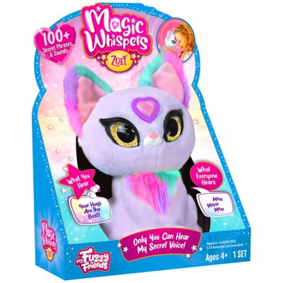 My Fuzzy Friends Magické zvieratká Zoe je interaktívna plyšová mačička, ktorá zaujme deti svojim jedinečným vzhľadom a kúzelnými funkciami. Mačička je vyrobená z jemného, príjemného plyšu v pastelových farbách, kombinujúcich svetlo fialovú s ružovými, tyrkysovými a fialovými detailmi na ušiach, chvoste av oblasti hrudi. Jej veľké čierne oči s trblietavými zlatými detailmi dodávajú postavičke výraz a roztomilosť. Na čele má mačička svetielkujúci kryštál v tvare srdca, ktorý je hlavným prvkom interakcie.