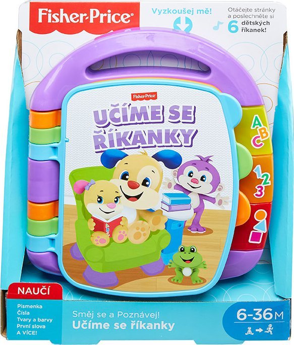 Predstavte svojmu dieťaťu svet zábavy a učenia s hrajúcou knižkou Učíme sa riekanky. Ďalší zástupca z kolekcie Smej sa a poznávaj od Fisher-Price vaše batoľa zabaví na naozaj dlhú dobu. Otočením stránky spustia obľúbené detské pesničky, pri ktorých si môžete spoločne prezerať pestrofarebné obrázky roztomilého psíka a jeho sestričky. Po stlačení svietiacich tlačidiel ABC a 123 budete počuť písmenká a čísla zodpovedajúce príslušnej stránke. Tlačidlo, ktoré zastupuje tvary a farby, po stlačení spustí krátke vety, ktoré batoľatám pomáhajú naučiť sa rôzne farby a tvary. Stránky sú pevné, preto sa ľahko otáčajú a deti si vďaka tomu rozvíjajú jemnú motoriku.