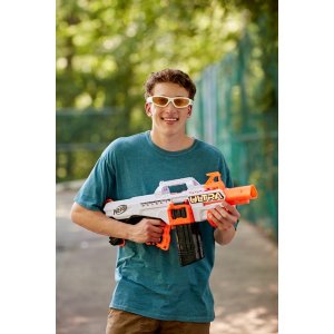 Nerf Ultra Select Blaster lze použít k pálení šipek pro dálkové nebo přesné střely! Ultra Select Blaster má prostor pro dva 10-Dart klip časopisy a obsahuje 10 Nerf Ultra Darts určených pro vzdálenost a 10 Nerf Ultra Darts navržených pro přesnost. Díky spínači na blasteru si můžete vybrat, ze kterého klipového zásobníku chcete střílet, abyste se během bitvy přepnuli. Namiřte na cíl a rychle za sebou střílejte šipky. Jednoduše stiskněte tlačítko plynu, aby se motor zapnul, a stiskněte spoušť. Klipové časopisy lze během hry rychle znovu načíst. Blaster odpaluje šípy Nerf Ultra na vzdálenost až 36 metrů. Šipky Nerf Ultra Precision jsou nejpřesnější šipky Nerf Ultra. Obsahuje rukojeť, kterou si můžete vzít s sebou kamkoli jdete.
