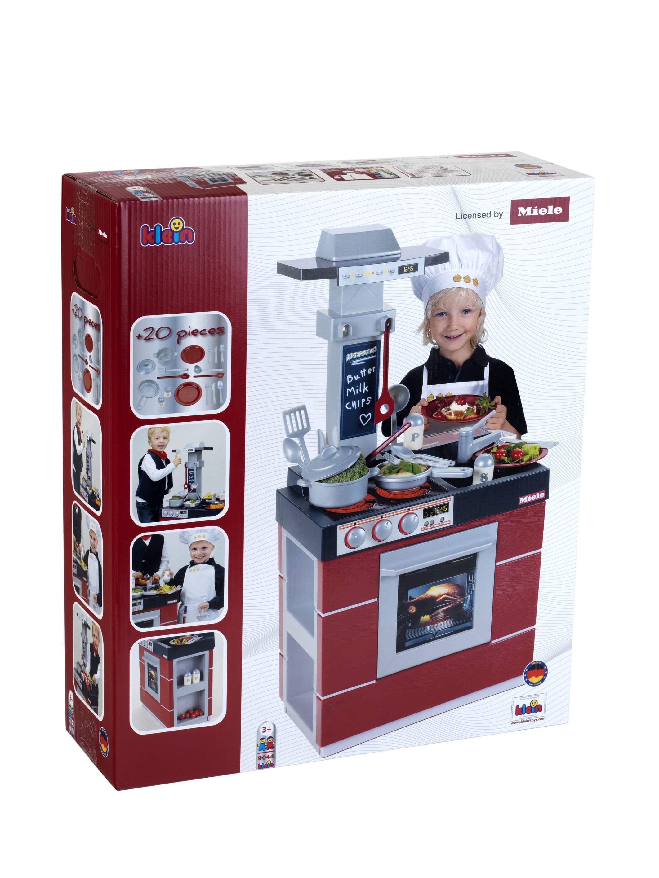 Kuchynka Klein je ideálnym darčekom pre malých kuchárov a kuchárky. Na kuchynke nájdu všetko potrebné. Na prednej strane je rúra, dvojplatničkový varič a drez, na zadnej strane je zásobník na vodu. Súčasťou je bohaté príslušenstvo, ako je hrniec, panvica, taniere, príbory a množstvo ďalšieho užitočného kuchynského náčinia. To môžete uložiť do úložných priestorov, ktoré nájdete na boku kuchynskej linky.