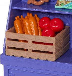 Sada Barbie „Malibu“ inspirovaná filmem „Barbie a Tereza Recept na přátelství na nákupech obsahuje barevný stánek a 2 police pro vystavování produktů.