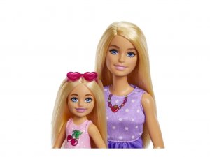 Zahŕňa bábiku Barbie "Malibu" vo fialových šatách a topánočkách a malú bábiku Chelsea v rozkošnom ružovom oblečku s čerešňami.