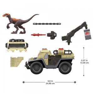 Pripravte sa na napínavú akciu a dobrodružstvo s Jurským svetom! Toto väčšie vozidlo, inšpirované filmami, je pripravené vyraziť a zajať dinosaurami na slobode! Vozidlo obsahuje pojazdné kolesá pre hru s tlačením, blaster pre streľbu na dinosaurami uspávacou šípkou, mostový žeriav so zachytávacím pazúrom, ktorý dvíha figúrky dinosaurov, a veľkú posteľ na prepravu dinosaurov. Oddeliteľné časti umožňujú drvivú akciu, keď sa figúrky dinosaurov bránia! Vozidlo je dodávané s pružnými reťazami na uzamknutie zajatých dinosaurov. Balenie obsahuje 1 figúrku dinosaura na hranie hneď po vybalení z krabice. Zahŕňa tiež držiak pre inteligentné zariadenie na hranie hier vylepšených aplikáciami. (Chytré zariadenie a dinosaurus nie sú súčasťou dodávky.)