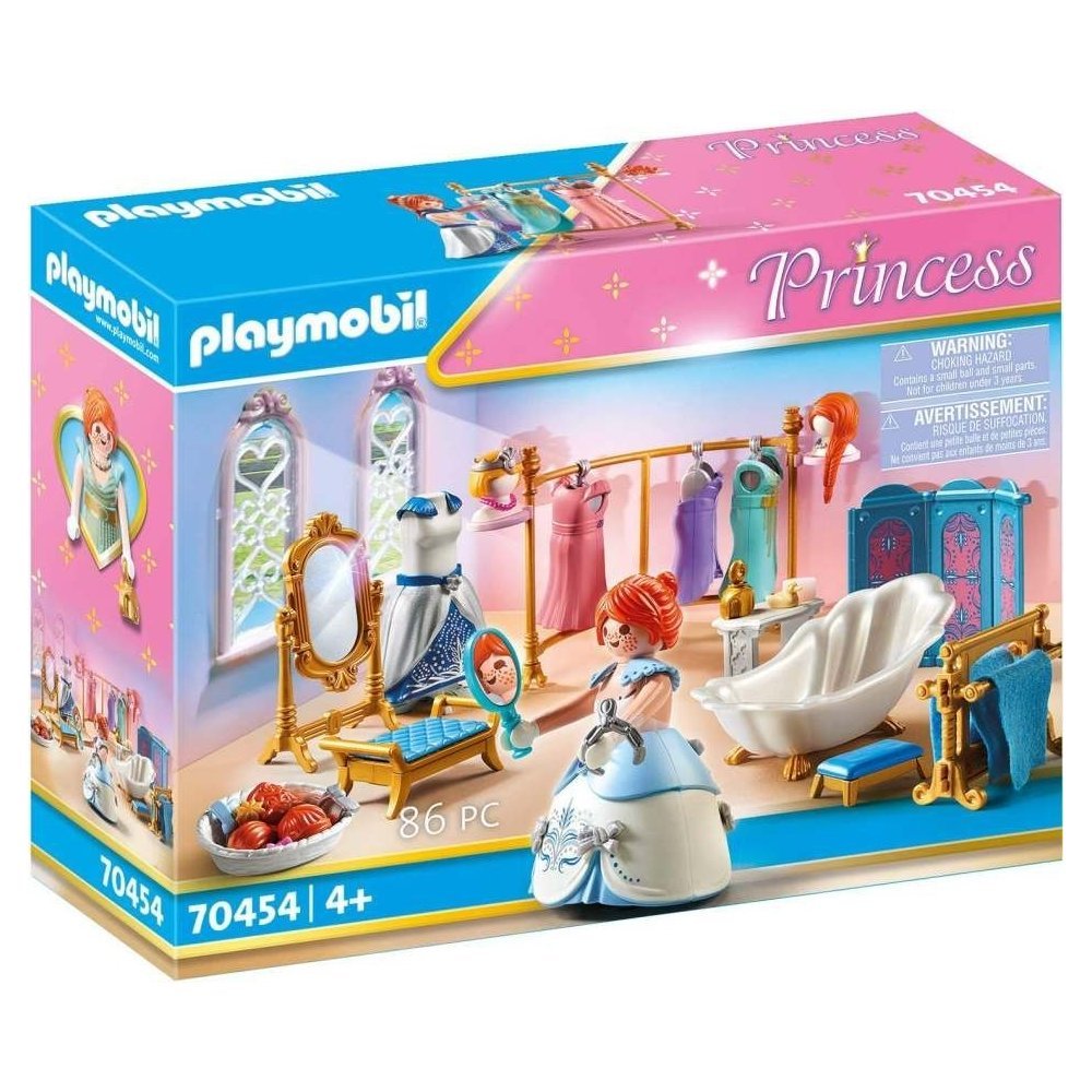 Herní sada obsahuje figurku PLAYMOBIL, princeznu Sally z Austrálie, mušlovou vanu, zástěnu, tyč na oděvy s věšáky a oděvy, plochu na líčení se zrcadlem a lavicí a mnoho dalších stylingových doplňků.