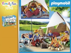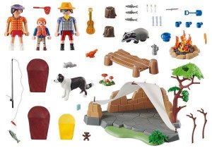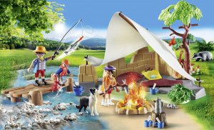 Po založení tábora se zapálí oheň a připraví se káva. Rodina jde okamžitě k vodě a snaží se chytit pár ryb na večeři. Váš věrný pes je samozřejmě vždy po vašem boku. Takhle je kempování zábavné! Herní sada obsahuje tři figurky PLAYMOBIL, psa, ohniště, podlahovou desku s polorozpadlou stěnou a plachtou, spací pytle, rybářský prut a mnoho dalších doplňků pro skvělá kempinková dobrodružství.