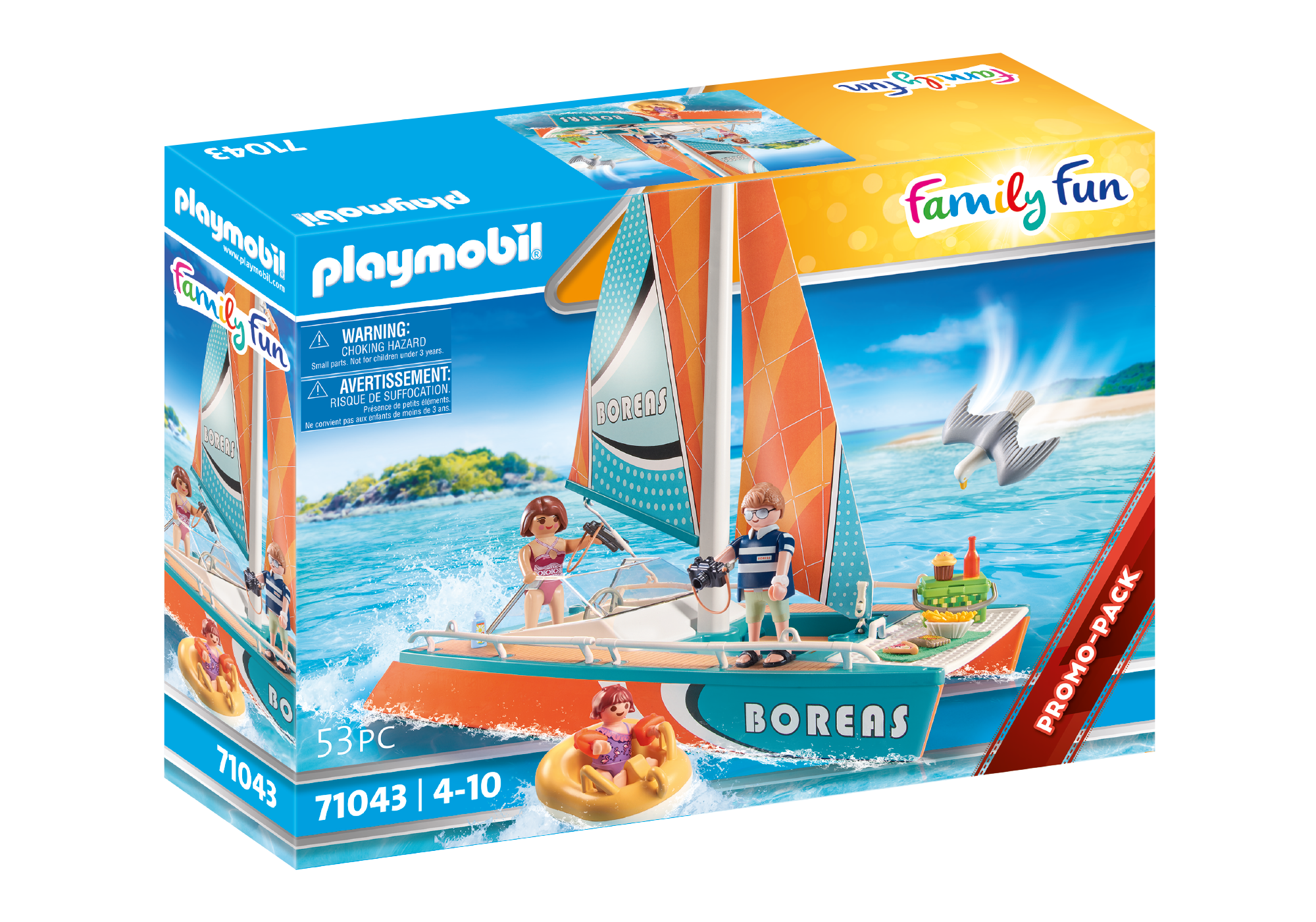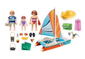 Vyplávame na more! Zažite vzrušujúce prázdninové sny na plávajúcom katamaráne PLAYMOBIL. Katamarán má mostík s kormidlom, posedenie so sklenenou podlahou, slnečnú sieť, dve plachty a množstvo chutného jedla pre pohodový deň na mori. Dievčatko sa môže nechať ťahať po vode v plaveckom kruhu. Dve vodné krídla zaisťujú potrebnú bezpečnosť. Skvelý darček alebo suvenír pre deti od 4 rokov. PLAYMOBIL Promo Pack v limitovanej edícii obsahuje tri figúrky PLAYMOBIL, katamarán, plávací kruh, chladiacu tašku, fotoaparát a mnoho ďalších doplnkov pre prehrávanie zábavných prázdninových zážitkov. Plavecké krídla, osuška, náramkové hodinky a kúpacie šľapky sú odnímateľné. Túto hraciu sadu je možné tiež ideálne kombinovať s ďalšími sadami z radu PLAYMOBIL Family Fun.
