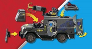 Moderné taktické terénne vozidlo so svetlom a zvukom, dvoma figúrkami PLAYMOBIL a početnými doplnkami pre vzrušujúce policajné operácie v detskej izbe.