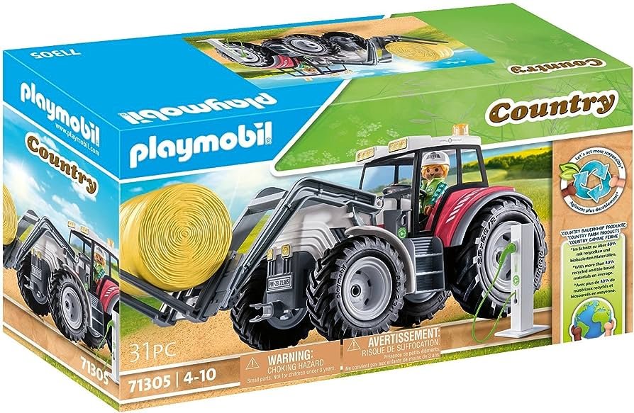 Tento veľký traktor od PLAYMOBIL má všetko, čo aktívne deti potrebujú, aby pomáhali farmárom pri práci na poli. S moderným traktorom je možné ťažké balíky sena bez námahy zdvíhať a odvážať a vďaka elektrickému pohonu je navyše šetrný k životnému prostrediu. Ak chcete „natankovať“ po práci, zájdete do e-nabíjacej stanice. Perfektný narodeninový alebo vianočný darček pre deti so záujmom o poľnohospodárstve.