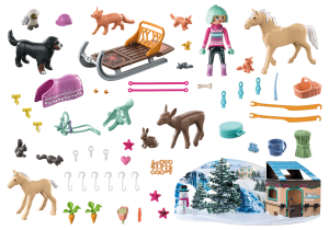 Vianoce na Waterfall Ranch! Za každým dverami je veľmi špeciálne prekvapenie pre váš svet Horses of Waterfall! Zimná prechádzka na saniach zavedie Isabellu, krásnu andalúzsku kobylu Buttercup, jej sladké žriebä Cream a bernského salašníckeho psa Lucy do neďalekého lesa Lelawala. Isabella tu pred veľkou hostinou kŕmia veľké i malé lesné zvieratá senom, zeleninou a ďalšími maškrtami. Jablkové sušienky z ovsených vločiek, pečené podľa receptu jazdeckej inštruktorky Muriel, sú konské obľúbené. Keď vychladnú, Isabella cez ne prehodí konskú deku. Zaujímavosť: Vianočné visačky na stromček vyrobila Zoeina mladšia sestra. Špecifikácia: S láskou navrhnutý adventný kalendár PLAYMOBIL pre svet Horses of Waterfall s Isabellou, kobylou Buttercup, žriebäťom Cream a psom Lucy, roztomilými lesnými zvieratkami, konskými saňami, uzdou, jedlom a sadou starostlivosti o kone. V saniach je miesto pre postavu a police na košík. Ozdoby na stromček je možné uložiť do darčekovej krabičky.