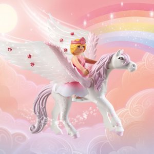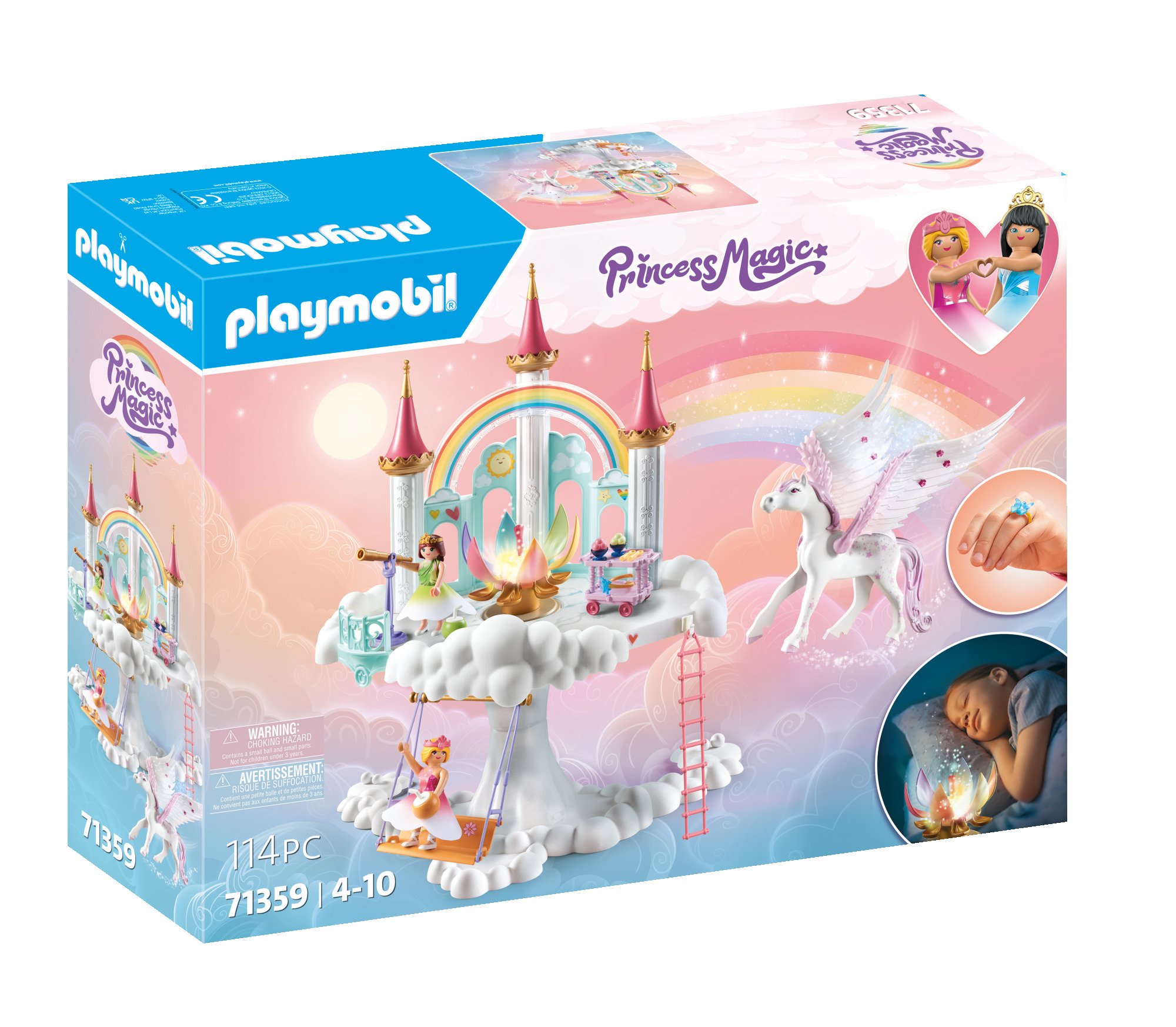 Kúzelný Dúhový hrad v oblakoch od PLAYMOBIL zavedie deti od 4 rokov do romantického, bavlnene bieleho kráľovstva plného kúzelných postavičiek, bájnych bytostí a rozprávkových stavieb. Princezné, chránené dúhou a svetlom dúhového kvetu, zaisťujú blaho všetkých tvorov. Skombinujte túto sadu s detskou izbičkou v oblakoch (71360) a oblakom šatne (71408) a vytvorte veľkú farebnú dúhovú scénu. Špecifikácia: • Hračka kúzelných princezien s dvoma figúrkami PLAYMOBIL, Pegasom s pohyblivými krídlami, dúhovým hradom s hojdačkou, žiariacou dúhovou kvetinou, archom samolepiek a mnohými ďalšími očarujúcimi doplnkami pre imaginatívne dobrodružstvo pri hraní rolí. • Módna zábava pri obliekaní: mäkkú obláčikovú sukňu je možné omotať okolo postavy a pripevniť sponkou. Figúrky môžu sedieť so sukňou a jazdiť na Pegasovi • Kráľovské doplnky: Súčasťou hernej sady je roztomilý krúžok s motýľmi pre deti • Kúzelné svetelné efekty: Svetelný modul s LED diódami meniacimi farby v dúhovom kvete poskytuje veselú svetelnú show s meniacimi sa farbami ako nočné svetlo. Automatické vypnutie po 4 minútach
