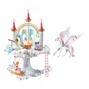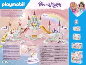 Vysoko v nadýchaných oblakoch je nebeský domov dúhových princezien. Sú chránení dúhou a svetlom kúzelnej žiariacej dúhovej kvety * (odnímateľná) a užívajú si život. Špeciálne prednosti: Pegasus, nebeská hojdačka a princezné s perovými sukňami na prezlečenie. Obsahuje roztomilé samolepky na zdobenie a krúžok s motýľmi pre dieťa! Do hradu je možné pridať ďalšie mraky. * Vyžaduje 3 x 1,5 V mikro batérie (AAA).