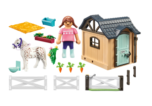Tento láskyplne navrhnutý set koňa obsahuje figúrku PLAYMOBIL, poníka, nadstavec jazdeckej stajne, napájačku, kvetináč na kvety a ďalšie skvelé doplnky. Dvere stajne a brány je možné otvoriť a zamknúť.