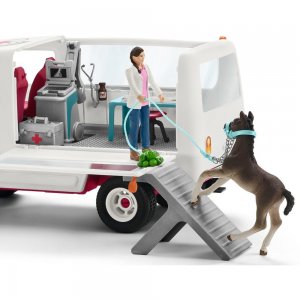 Balení obsahuje: mobilní veterinární kliniku (automobil o rozměrech 28 x 14 x 17 cm), stáj jezdecké školy o rozměrech 38 x 30 x 26 cm, dvě figurky koní, dvě figurky hříbat, pěn figurek lidí (jezdci, ošetřovatelka a veterinářka) a velké množství nejrůznějších doplňků.