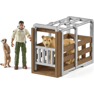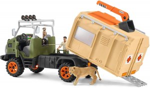 Správca parku Tom a jeho kamarát PERMONÍK Ted idú spoločne vo veľkom záchrannom voze pre zvieratá Schleich®Wild Life na svoju prvú spoločnú misiu. Na Safari nájdu Tom a Ted levicu, ktorá musí byť urgentne ošetrená. Tom a Ted teda spustia ošetrovacie kabínu auta na zem. Teraz možno začať s ošetrením, pretože auto je na to perfektne vybavené. Obväzy a stetoskop má ranger Tom stále pri ruke.