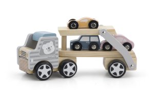 Dřevěný kamion se 4 auty je tou pravou hračkou pro všechny malé řidiče. Sklápěcí nákladní plocha umožní autům pohodlně najet na kamion a stejně pohodlně z něj opět sjet.Rozměry: 29 x 15 x 8 cmVhodné pro děti od 18 měsíců.