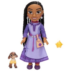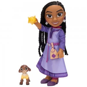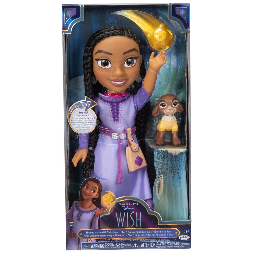 Dětská verze Asha nosí fialové šaty jako ve filmu a je dodávána s odpovídajícím páskem a taškou na opasek. Součástí jsou také šperky a boty, stejně jako umělecký pletený účes. Chcete-li znovu vytvořit své oblíbené okamžiky z "Wish", Asha přichází s figurkami malého kozla Valentina a Wishing Star. Při výšce asi 35 cm je hrací panenka Asha vhodná na to, abyste si ji vzali kamkoli.