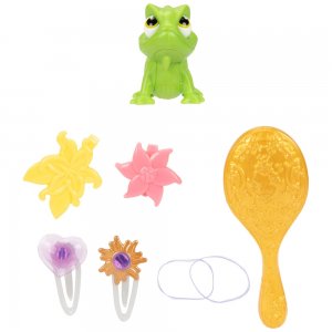 Obsah: Rapunzel s funkcí zpěvu, diadém, kartáč na vlasy, dvě spony do vlasů, kartáč na panenku, čtyři sponky do vlasů, figurka chameleona Pascala