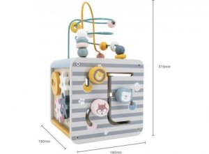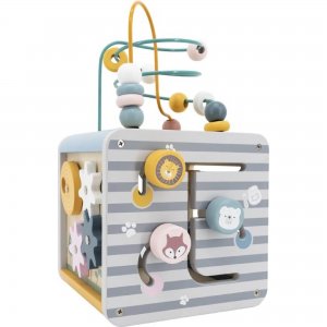 Interaktivní hračka pastelových barev, nabízí pět stran různorodých zábavných aktivit. V horní části lze posouvat tvary po drátech, ze strany jsou otáčecí obrázky, ozubená kolečka a nebo také vkládačka se zvířátky. Vícero aktivit zaujme pozornost dítěte a rozvíjí tak jeho smyslové vnímání.