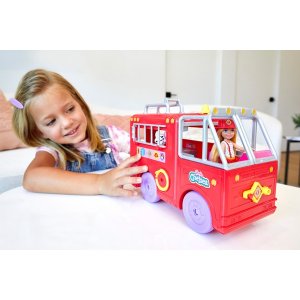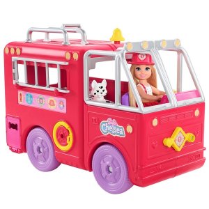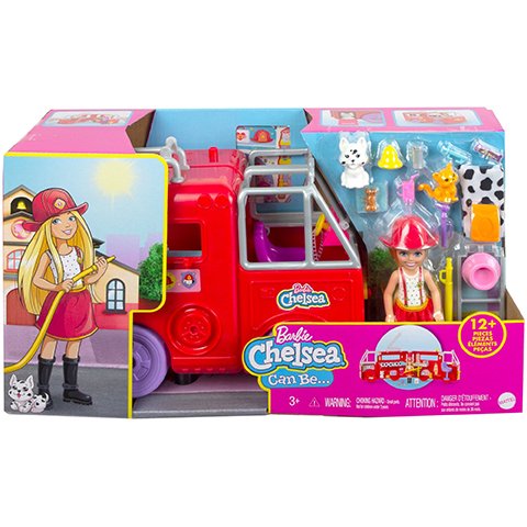 mohou děti otevřít hasičské auto a odhalit palandu, záchranářský žebřík, skládací hasičskou hadici, umyvadlo, stanici první pomoci a další Podrobný popis:Děti mohou pomoci panence Chelsea™ zachránit den s jejím vlastním hasičským autem.