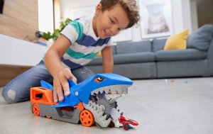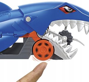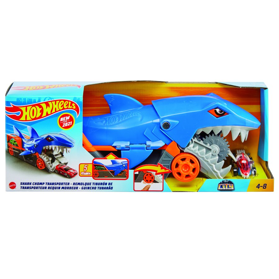 • Přepravní vozidlo Hot Wheels® Shark Chomp je dodáváno s jedním autem Hot Wheels® v měřítku 1:64 a pojme až čtyři další (prodávají se samostatně)! Děti od čtyř let si zamilují ukusování z úklidu!