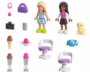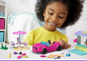 • Růžový kabriolet a stánek se zmrzlinou k sestavení s detaily interiéru a promenádou 225 kostek obsahuje 2 mikropanenky Barbie k sestavení, 1 štěně, oblečení a doplňky k jídlu
